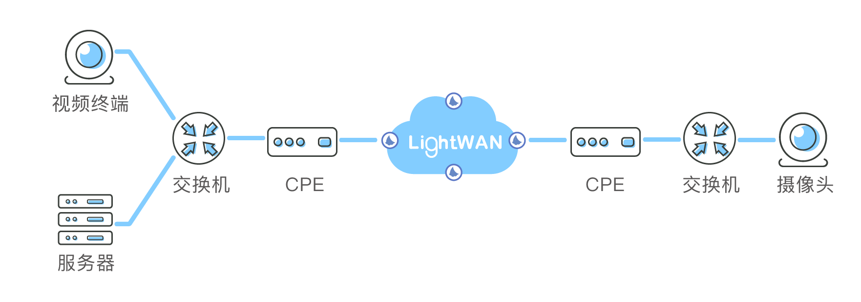 通过分别在企业用户各地办公网络中部署 LightWAN 专用接入设备(同时覆盖 MCU 及视频终端),将用户两端的视频会议流量导入 LightWAN 传输优化网络,从而显著提升用户视频会议流量的传输效率和稳定性,并保障视频会议的流畅召开。用户也可通过安装 LightWAN 客户端软件以解决移动办公中使用视频会议软件客户端召开视频会议时的优化需求。